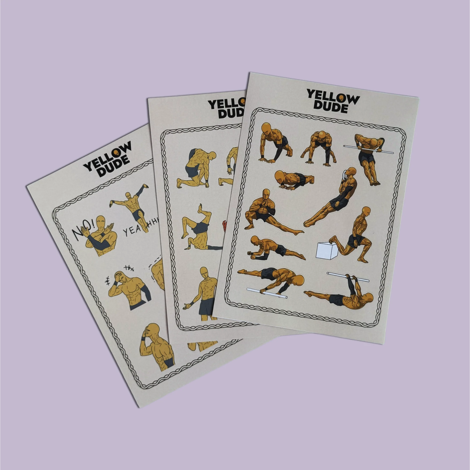 Durable vinyl stickers featuring iconic Yellow Dude designs. Stick them on your bottle, laptop, or gym gear. Sweat-proof, weather-proof, and made to keep your grind visible.