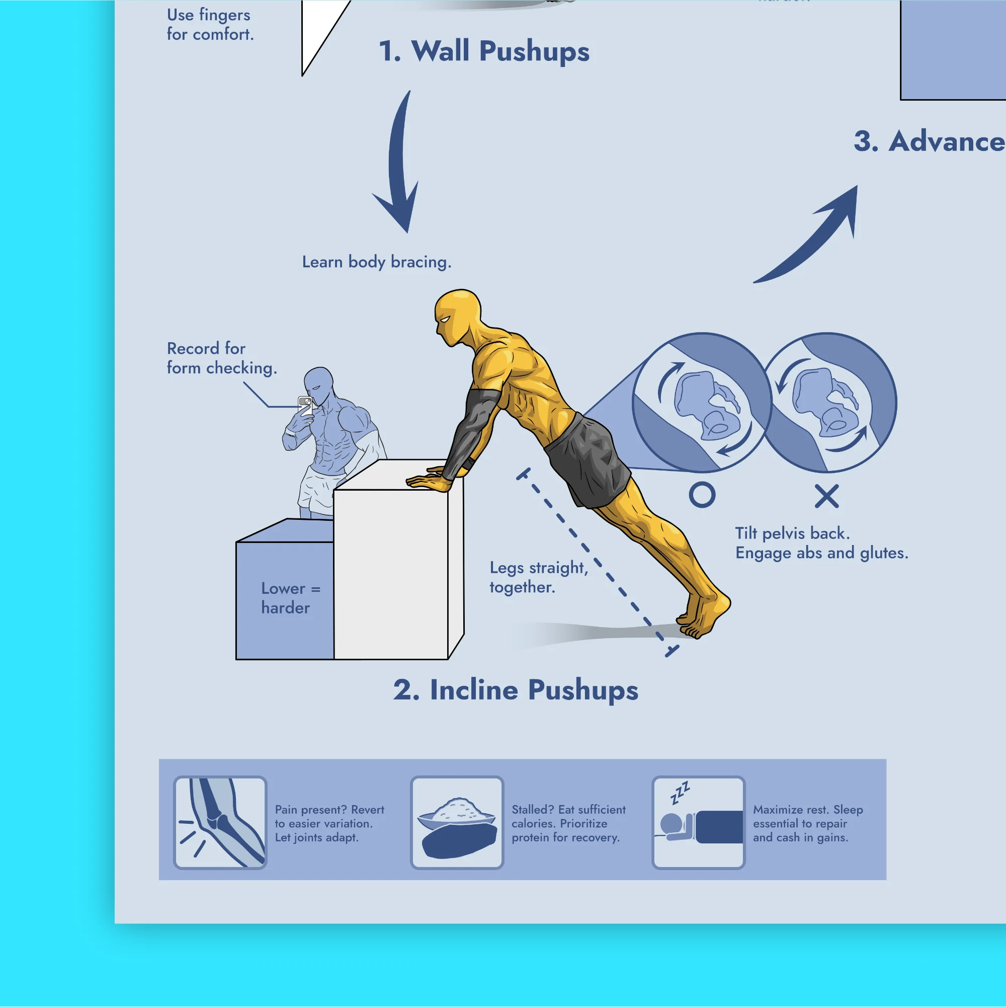 Every pushup progression, form cue, and skill on your wall. From wall to full. Hang it where you train. Reference it when you forget. Actually do pushups.